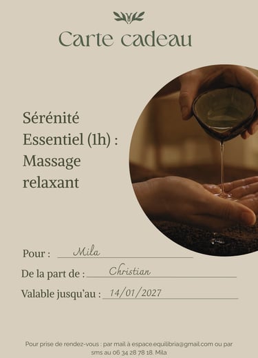 Chaque bon cadeau est valable pour un massage/atelier unique, adapté aux besoins et à l'état d'esprit du moment de la personne que vous souhaitez gâter.